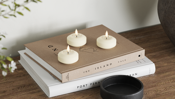 For et roligt helhedsindtryk kan du samle lysene på et fad og variere højderne, mens farverne holdes i samme palette.