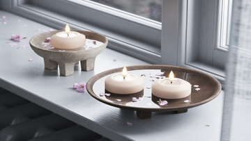 Flytljus placeras i skålar och fat med vatten. Det ger en enkel atmosfär – både inne och ute.